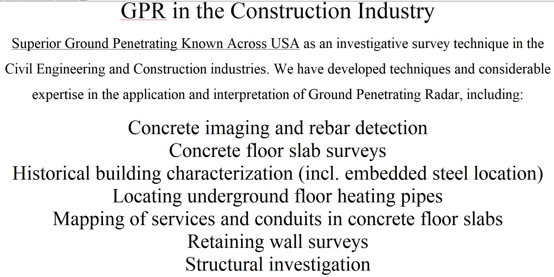 what can ground penetrating radar detect Feedback Palmdale Ground Penetrating Radar Services Util Locate-ground-penetrat... As a non-destructive and dynamic survey technique, GPR can be applied on a variety of surfaces including rock, soil, ice, fresh water, pavements, and concrete ... Ground Penetrating Radar (GPR) | Utility Services of ... services . ground penetrating radar ca from GPR Is Able to Detect "Untraceable" Facilities Including: Storage tanks; Buried manholes; Septic tanks; Water and sewer